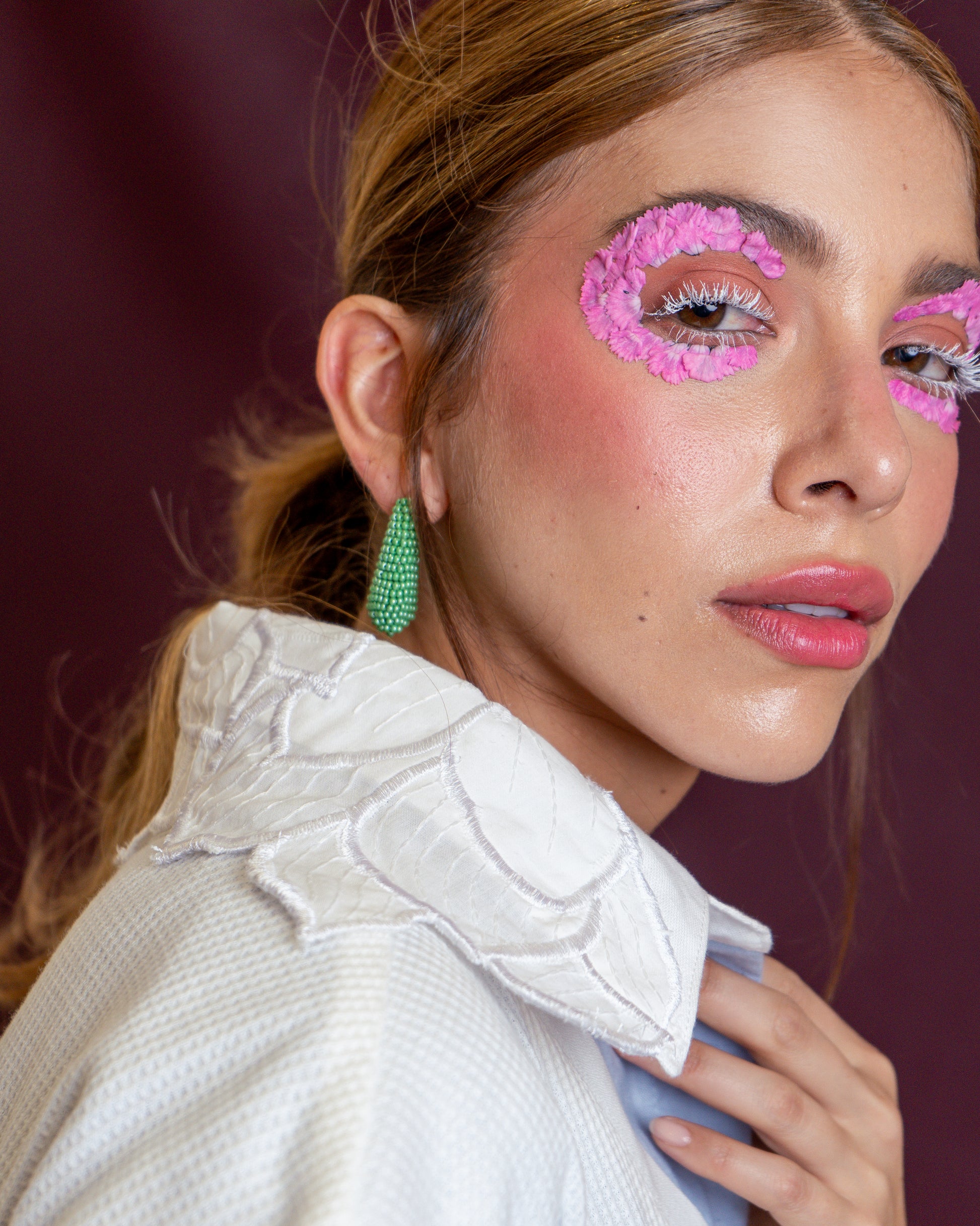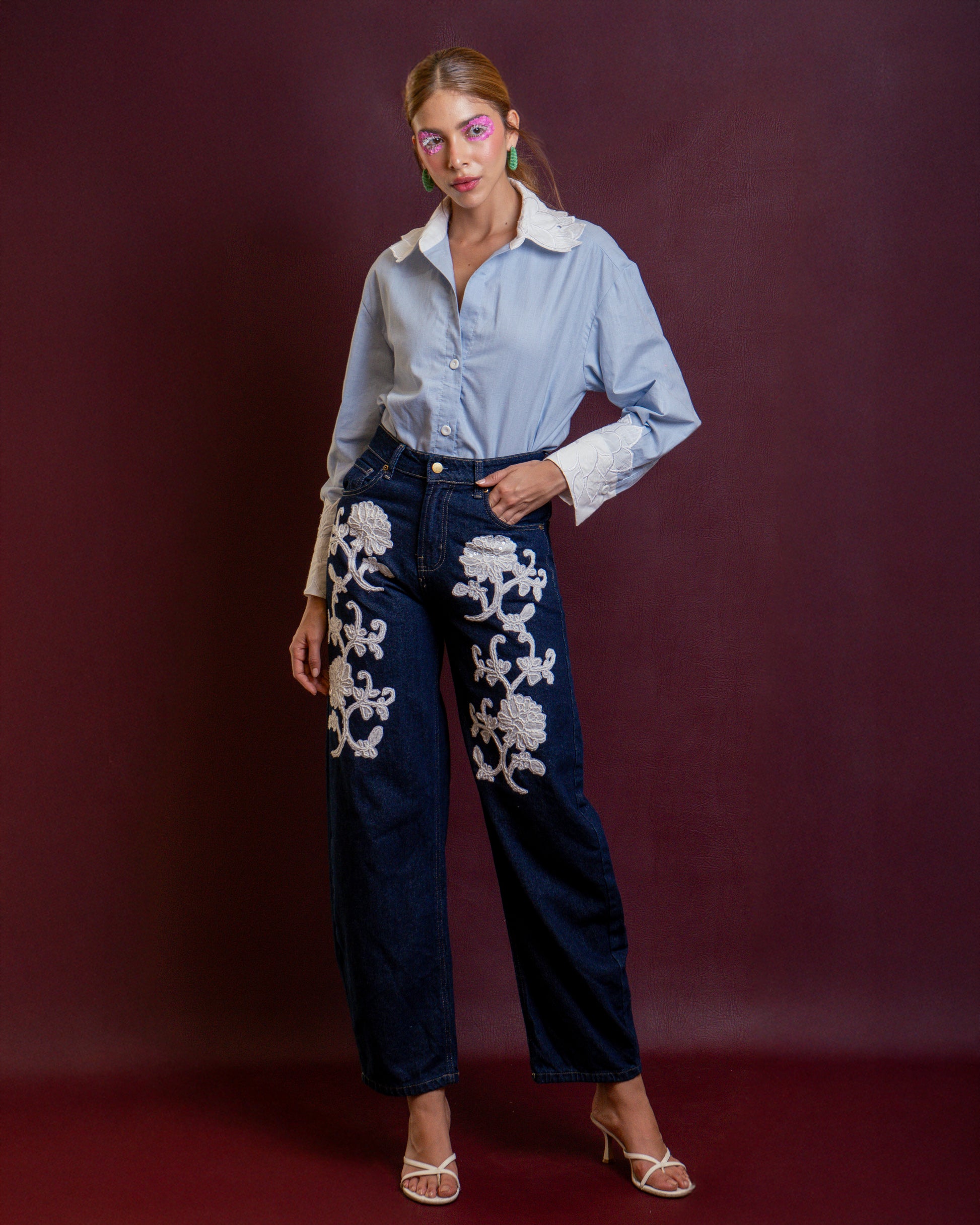 Camisera en lino 100% algodón, color de base azul cielo, contraste en puños y cuello, rebordado en Ojalillo en tono blanco.