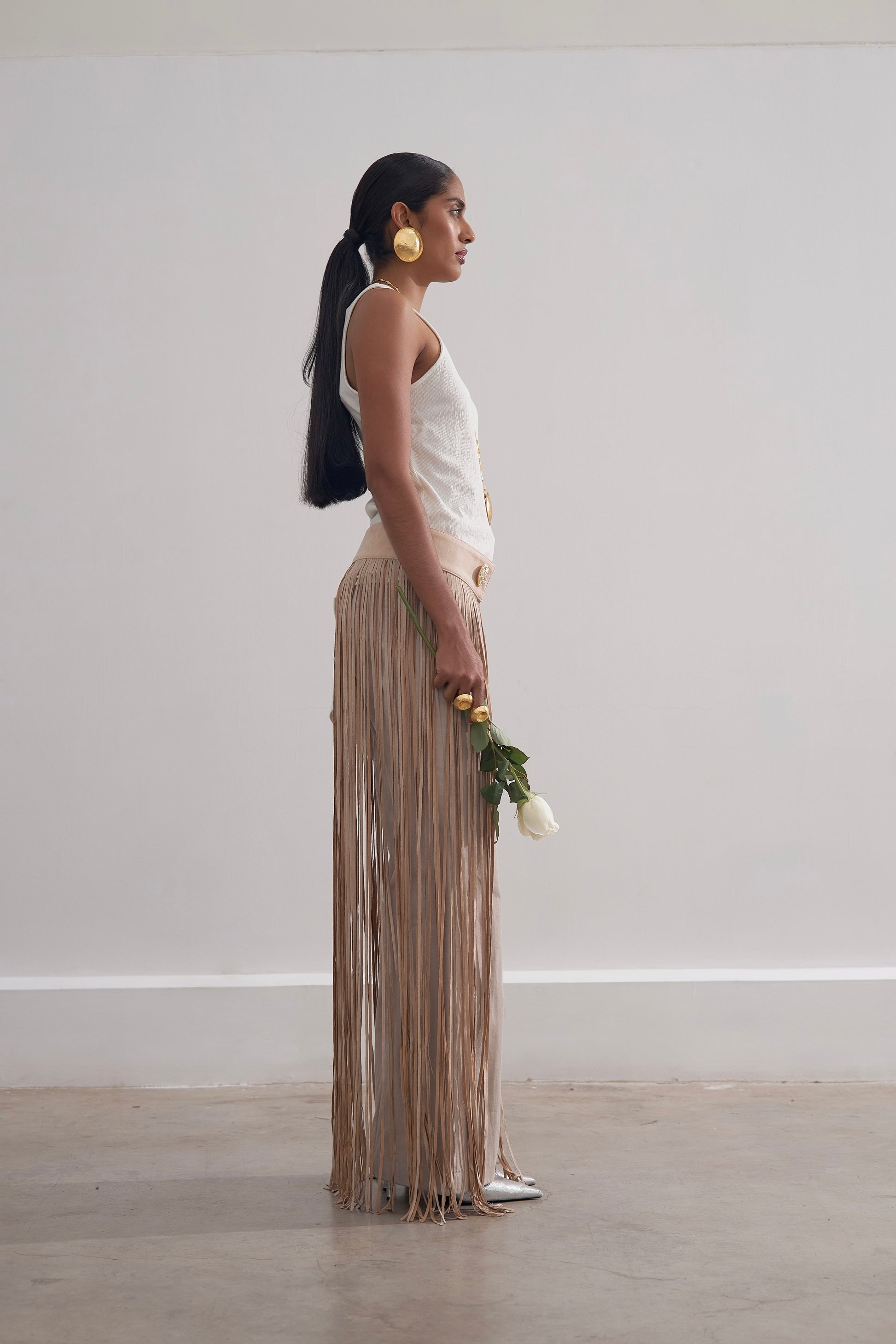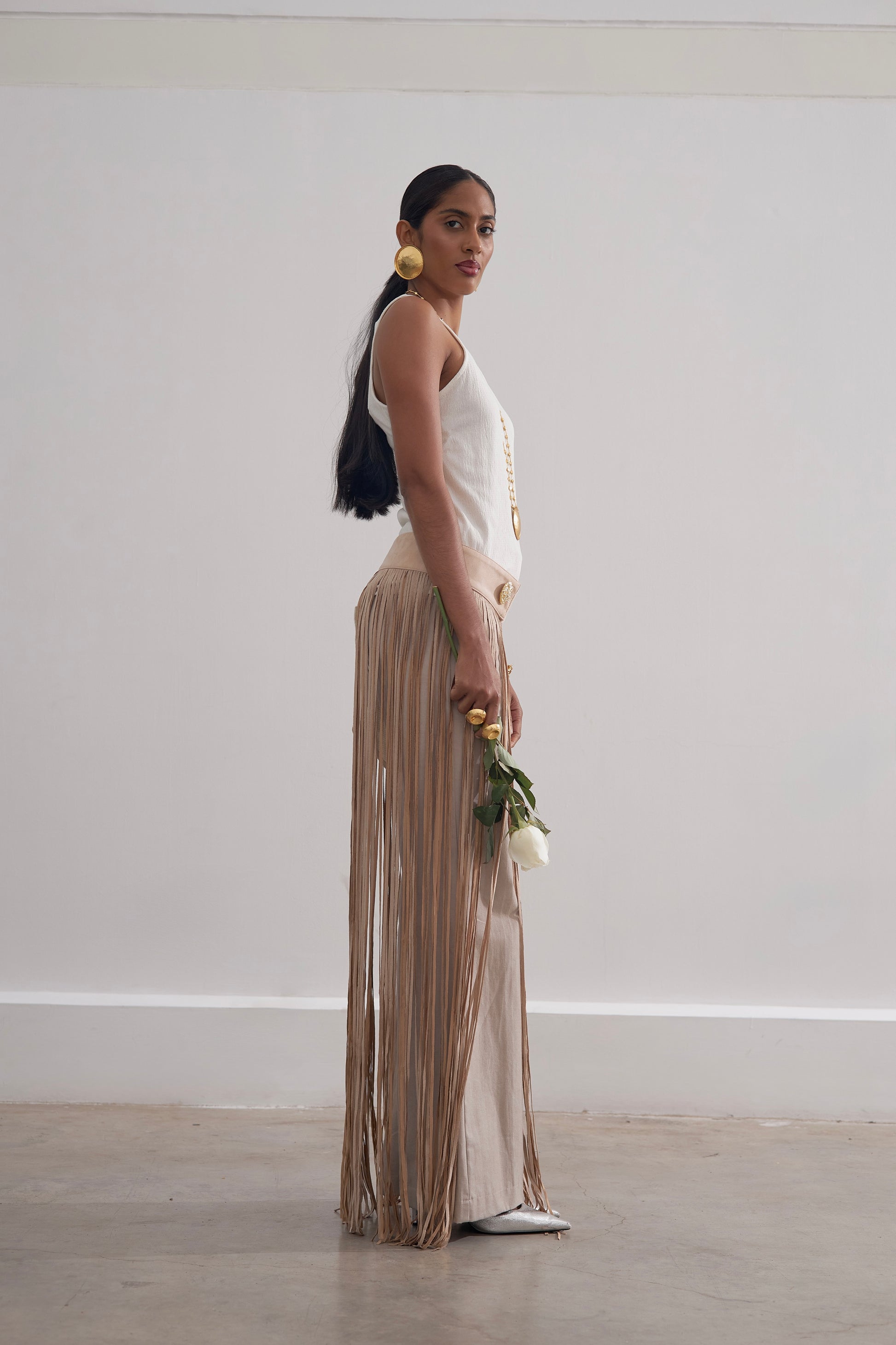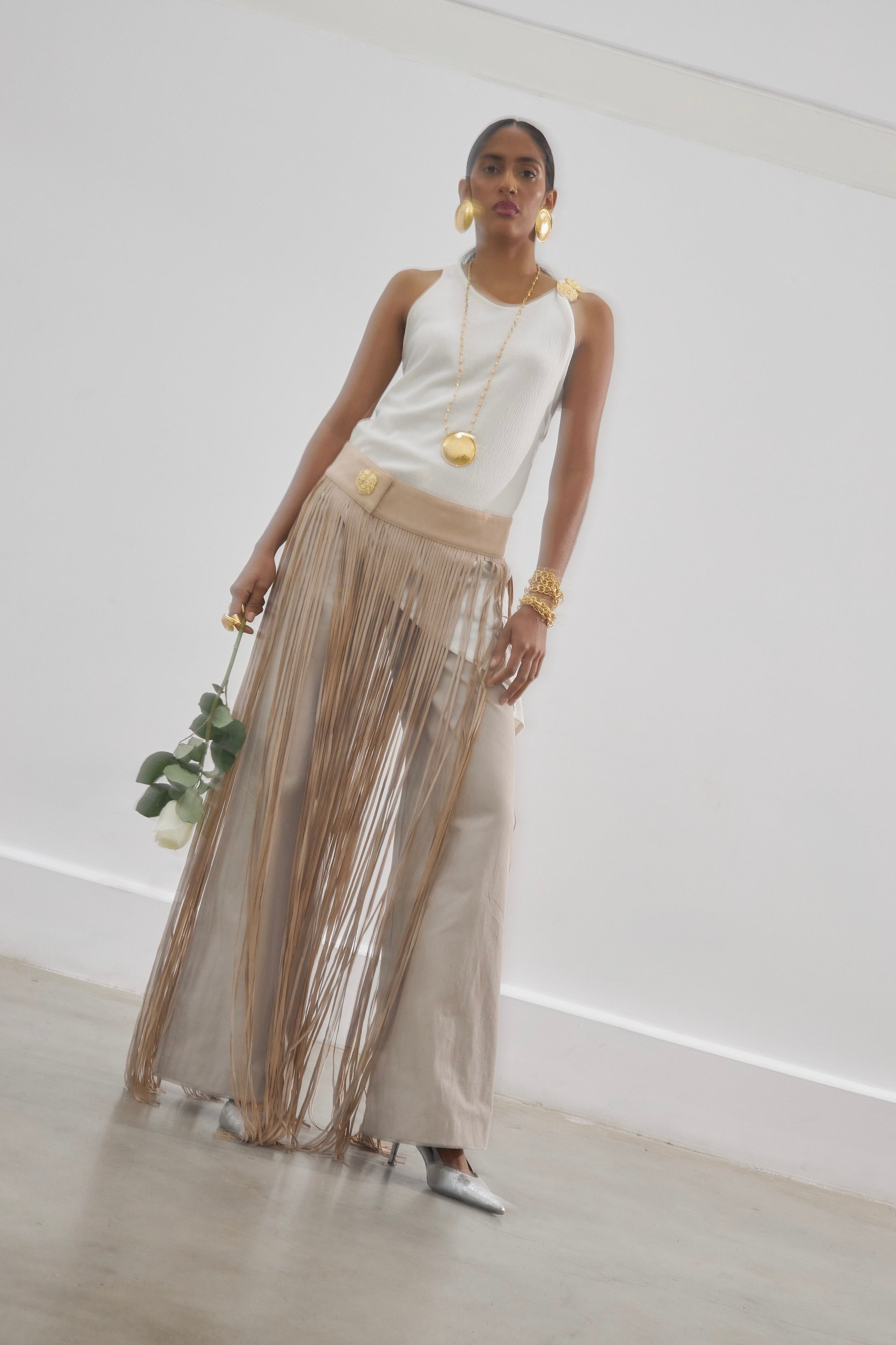 Pantalón en dril rígido algodón 100%, en tono camel y negro, con cinturón en gamuza troquelada a tono, con botón dorado en material zamak, corte recto y bolsillo. Artesanía de lujo Colombiana.