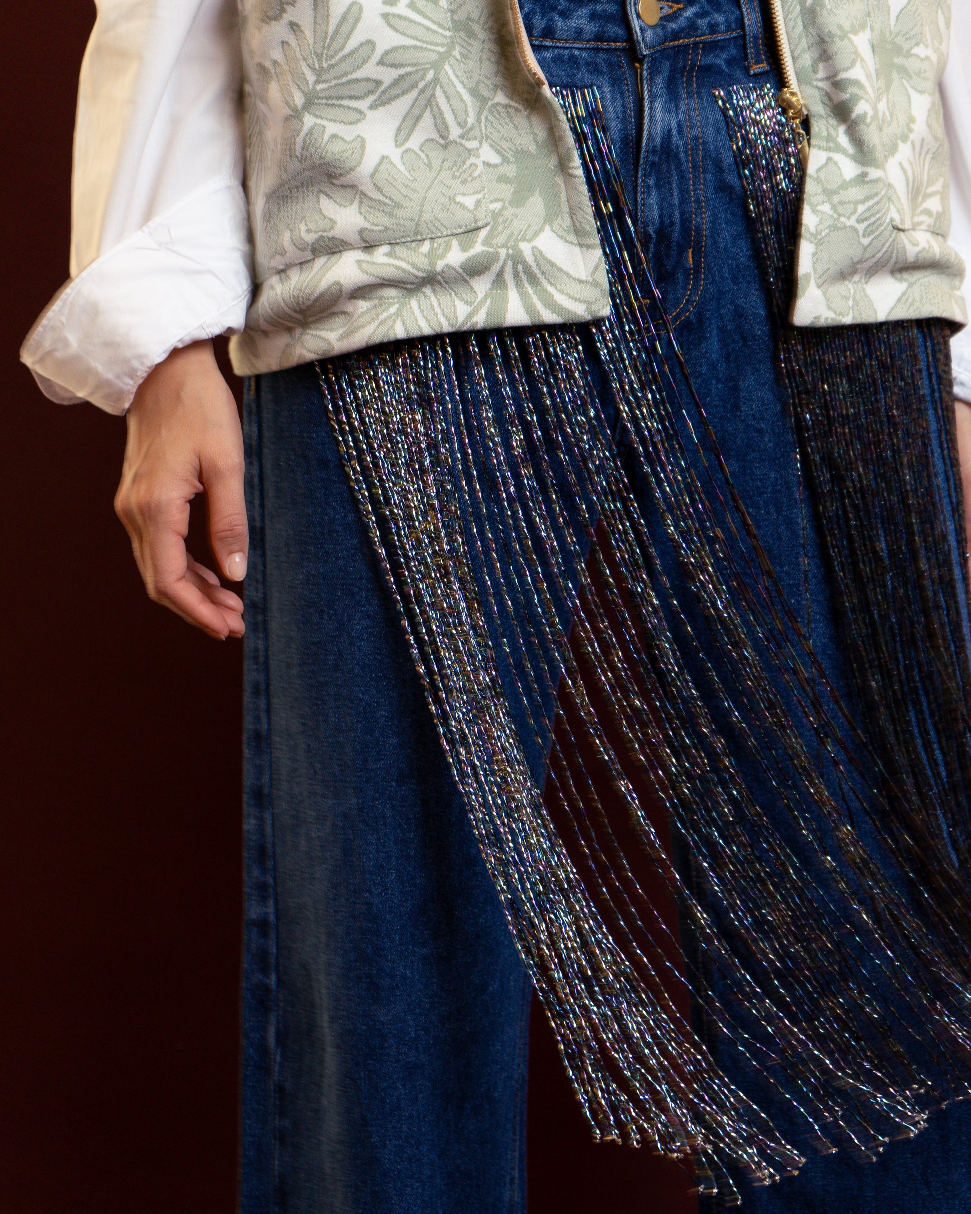 Denim 100% algodón, en todo índigo profundo, bordado a mano en canutillos tornasolados, por mujeres artesanas Santandereanas.