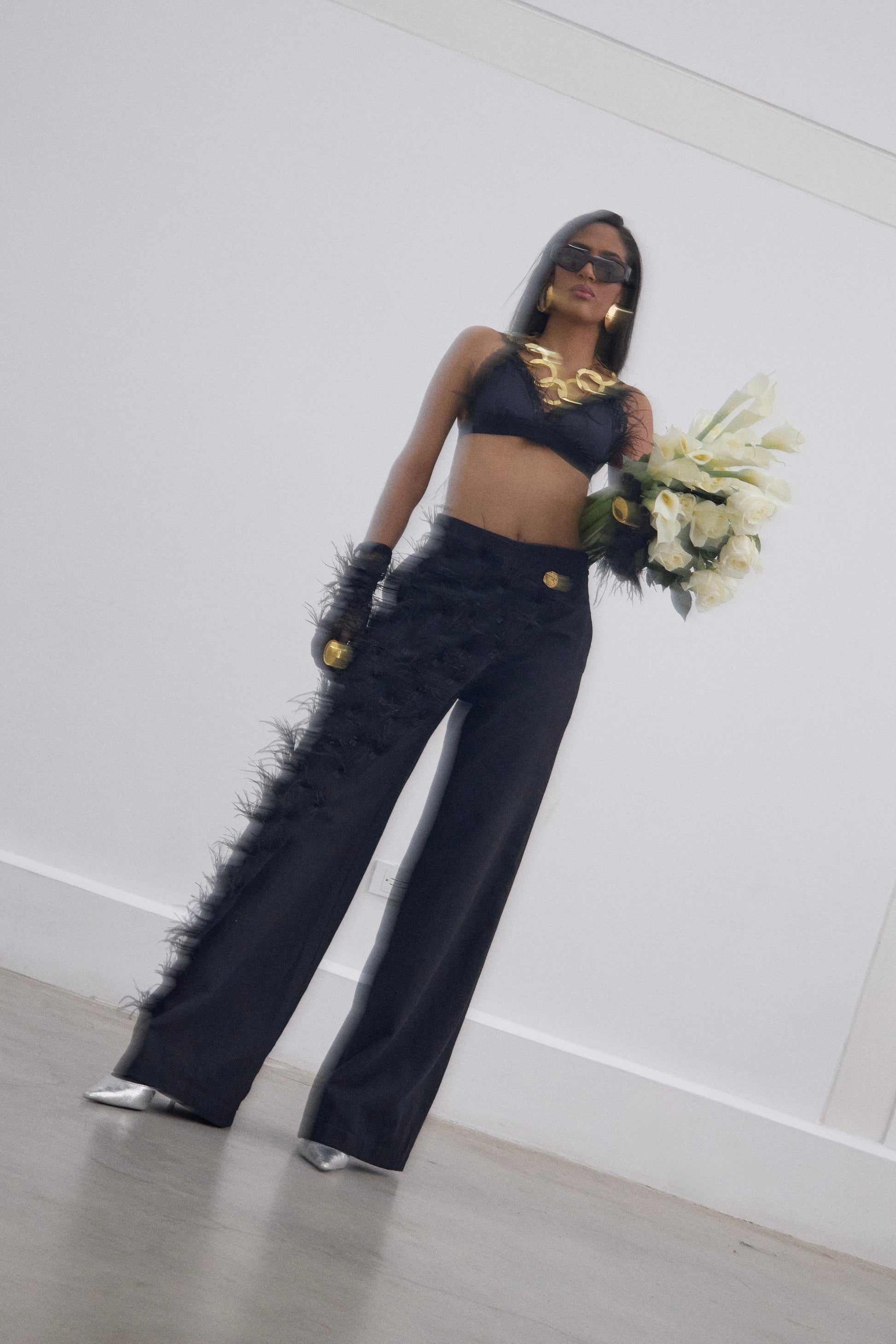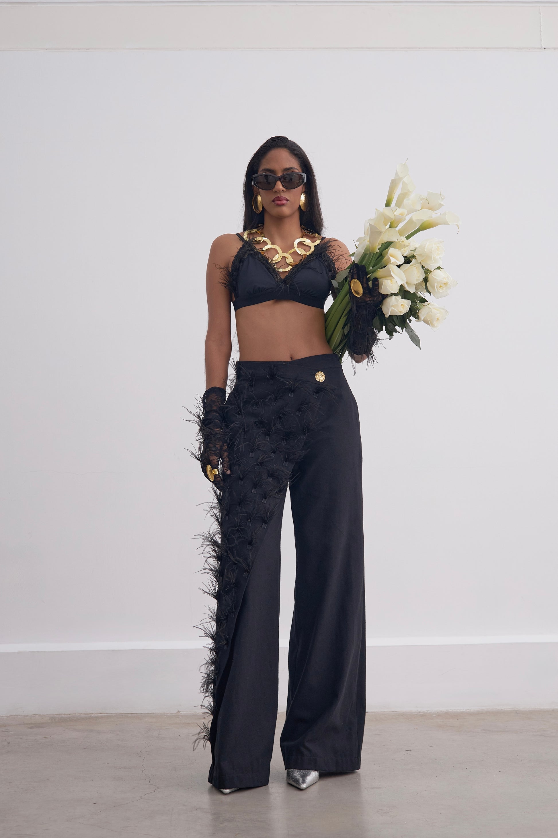Pantalón en dril liviano algodón 100%, en tono negro, con pieza delantera asimétrica bordada en plumas de seda a tono, doble botón dorado en material zamak, corte recto y bolsillo. Artesanía de lujo Colombiana.