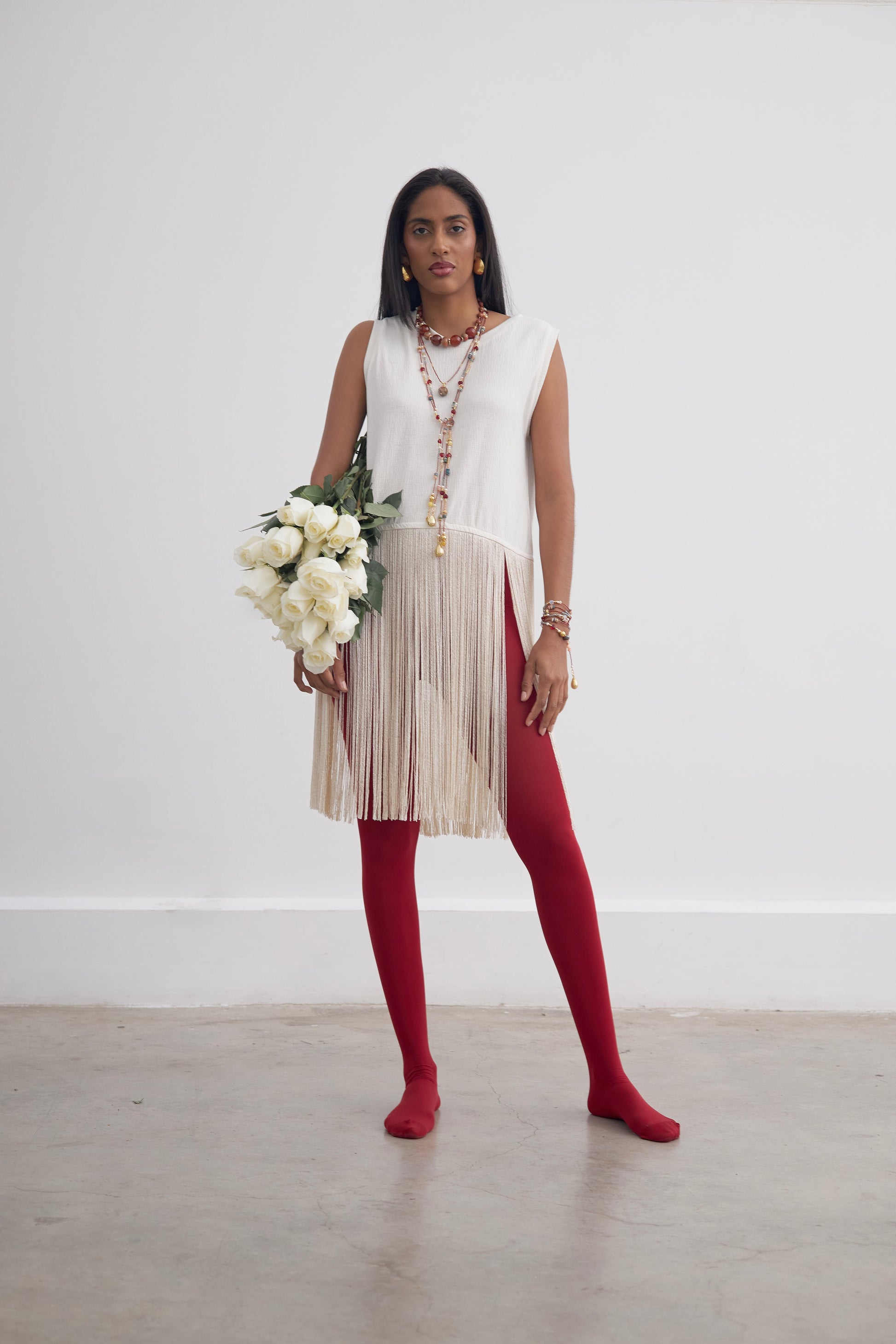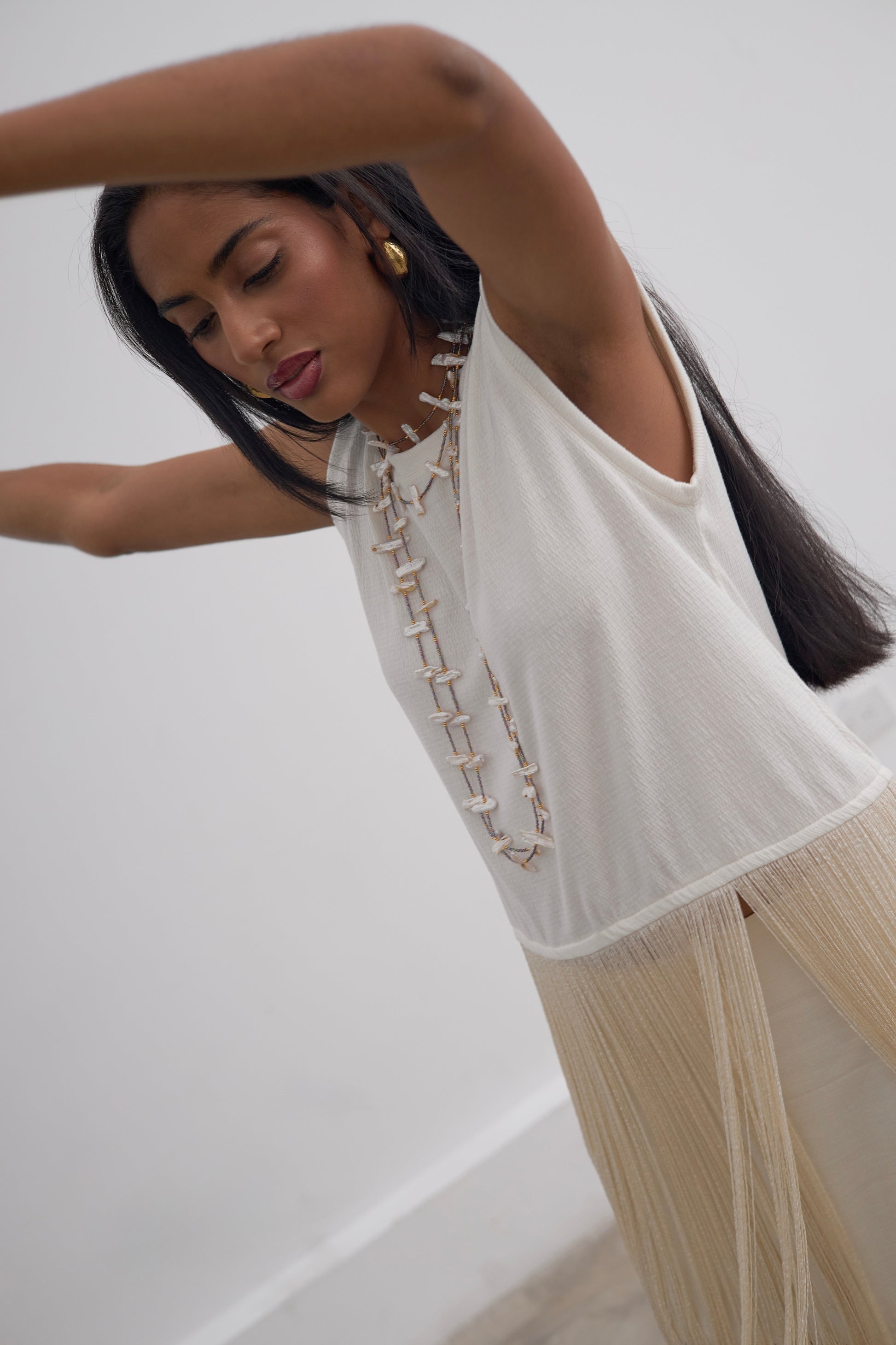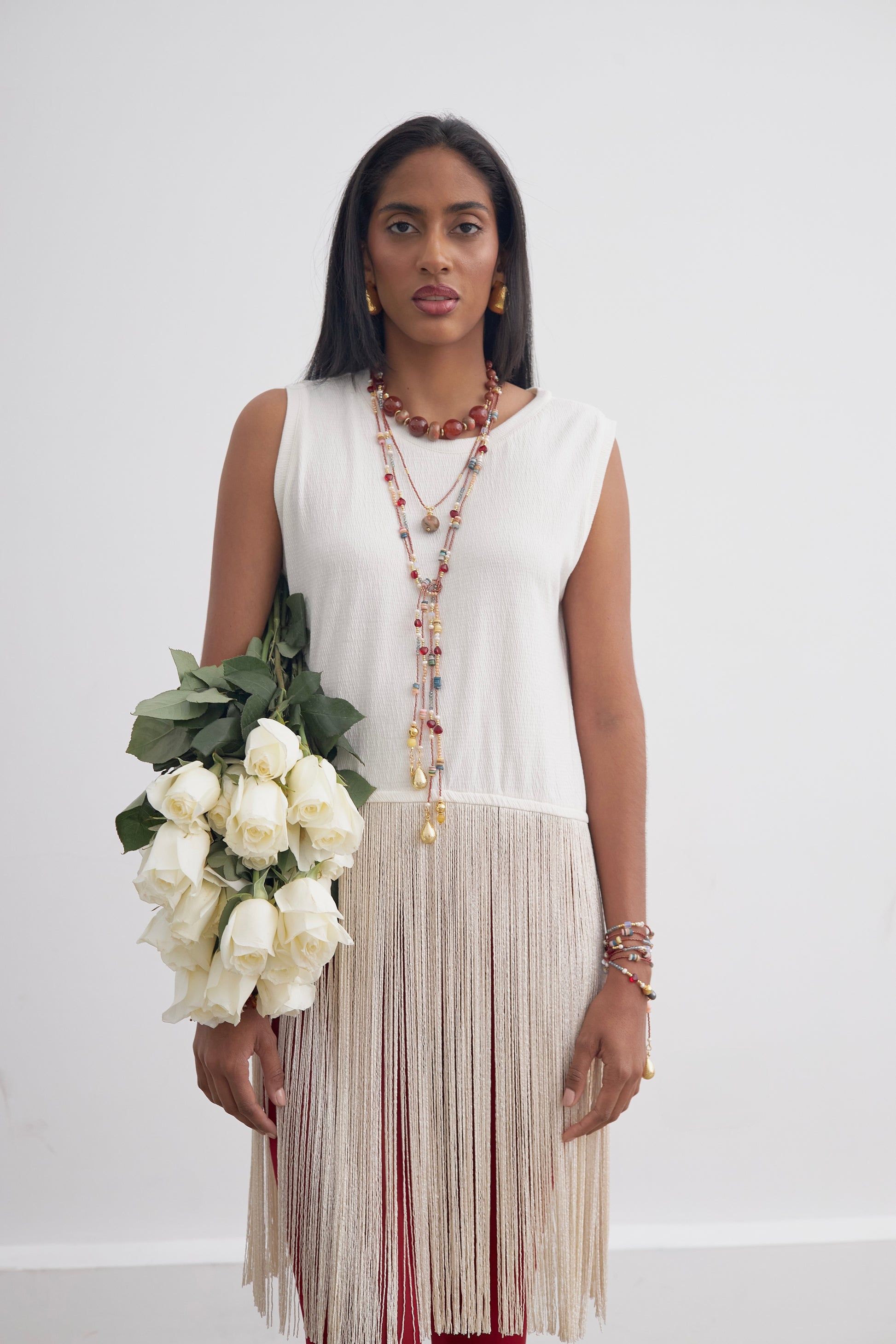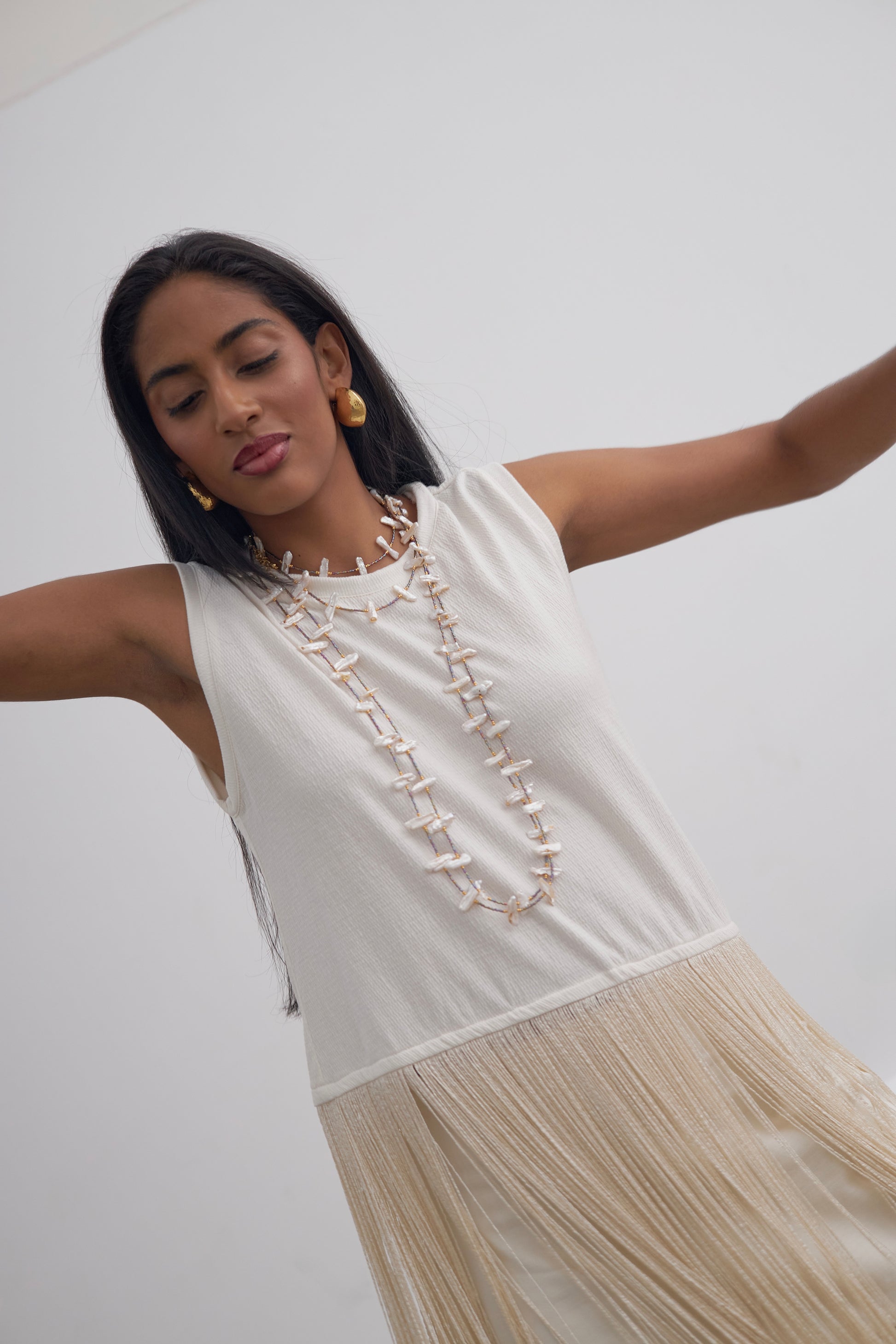 Talego en seda de algodón, tonalidad crudo, con doble capa de flecos de 50 cm a tono, manga sisa. Artesanía de lujo Colombiana.