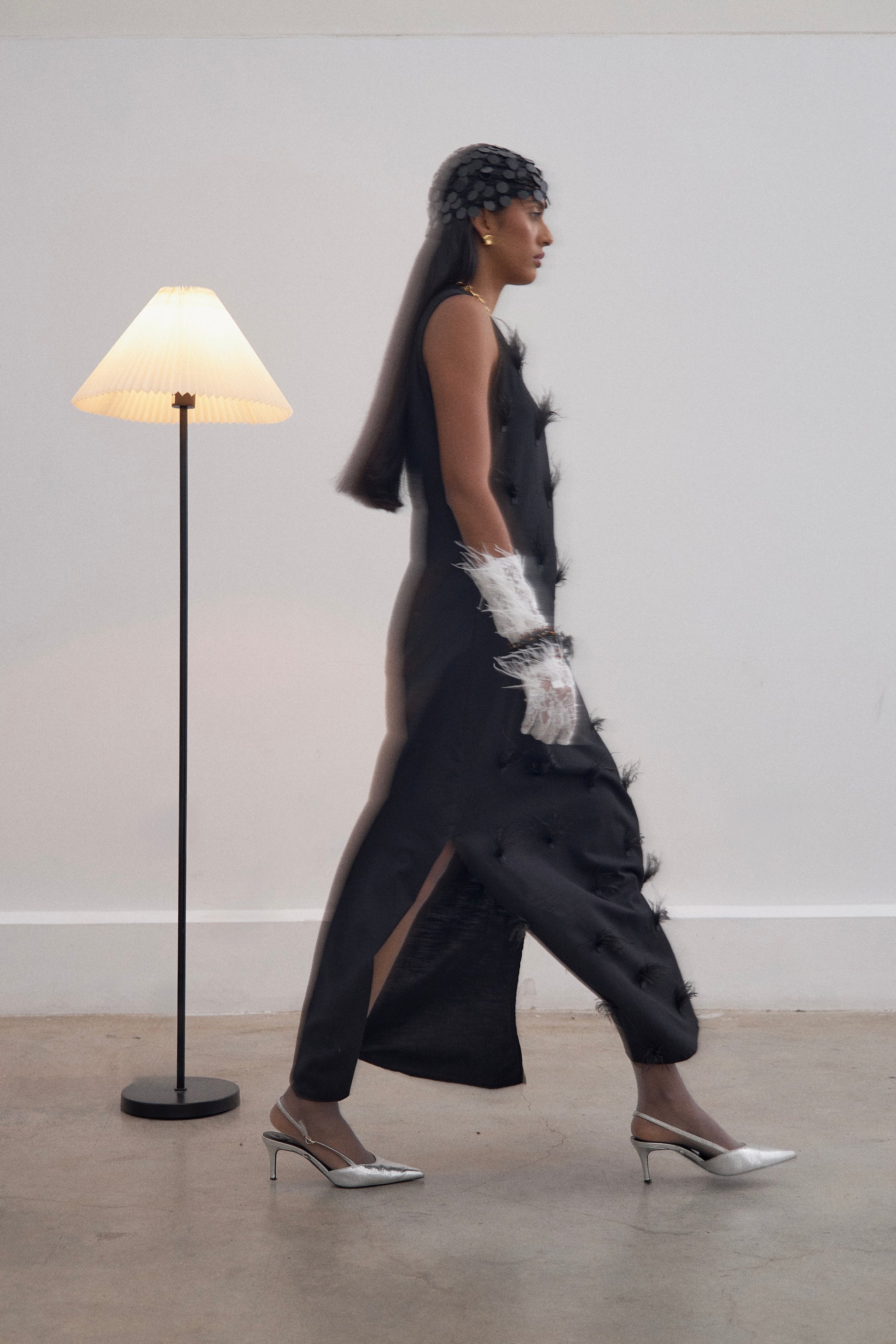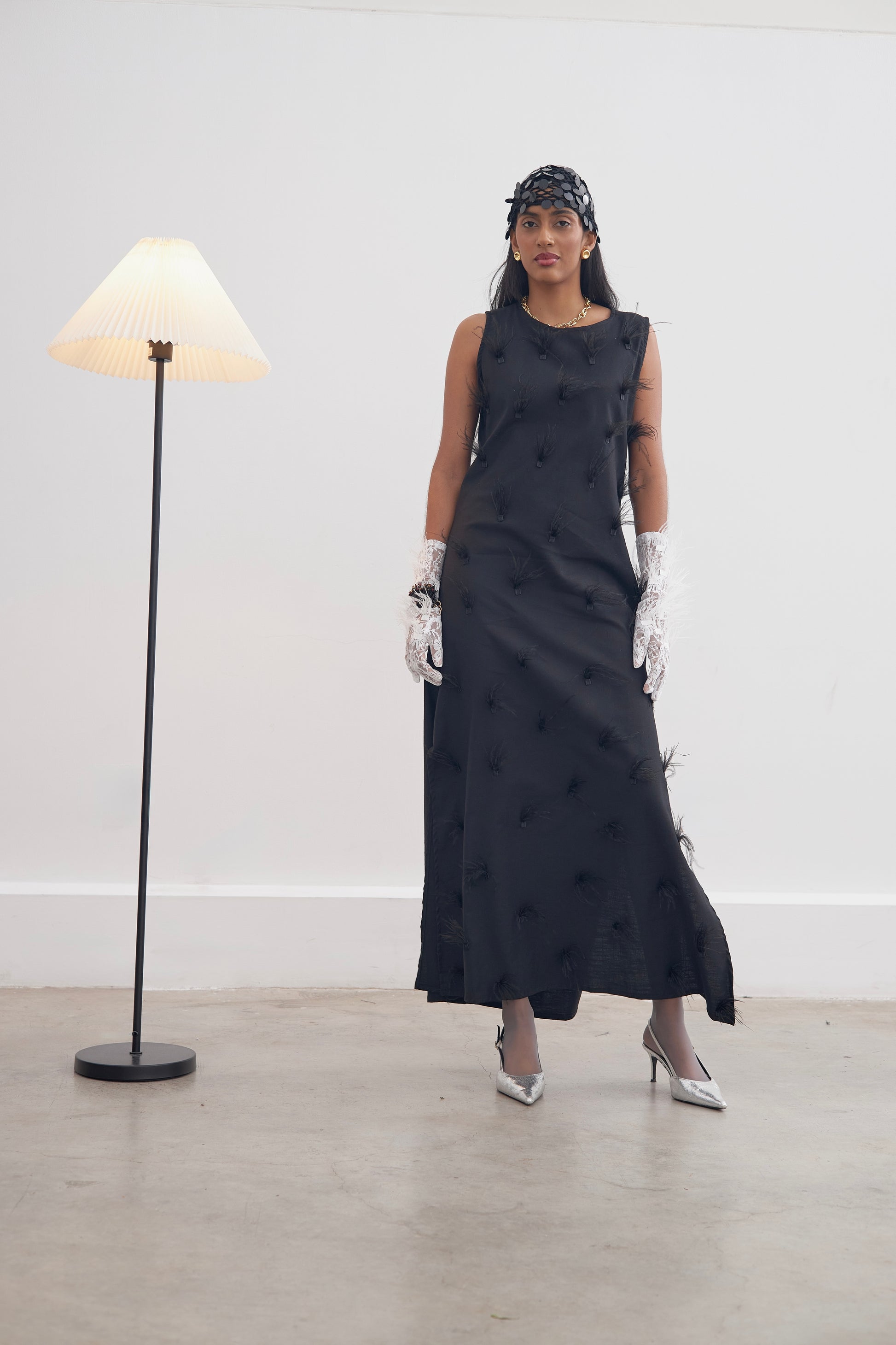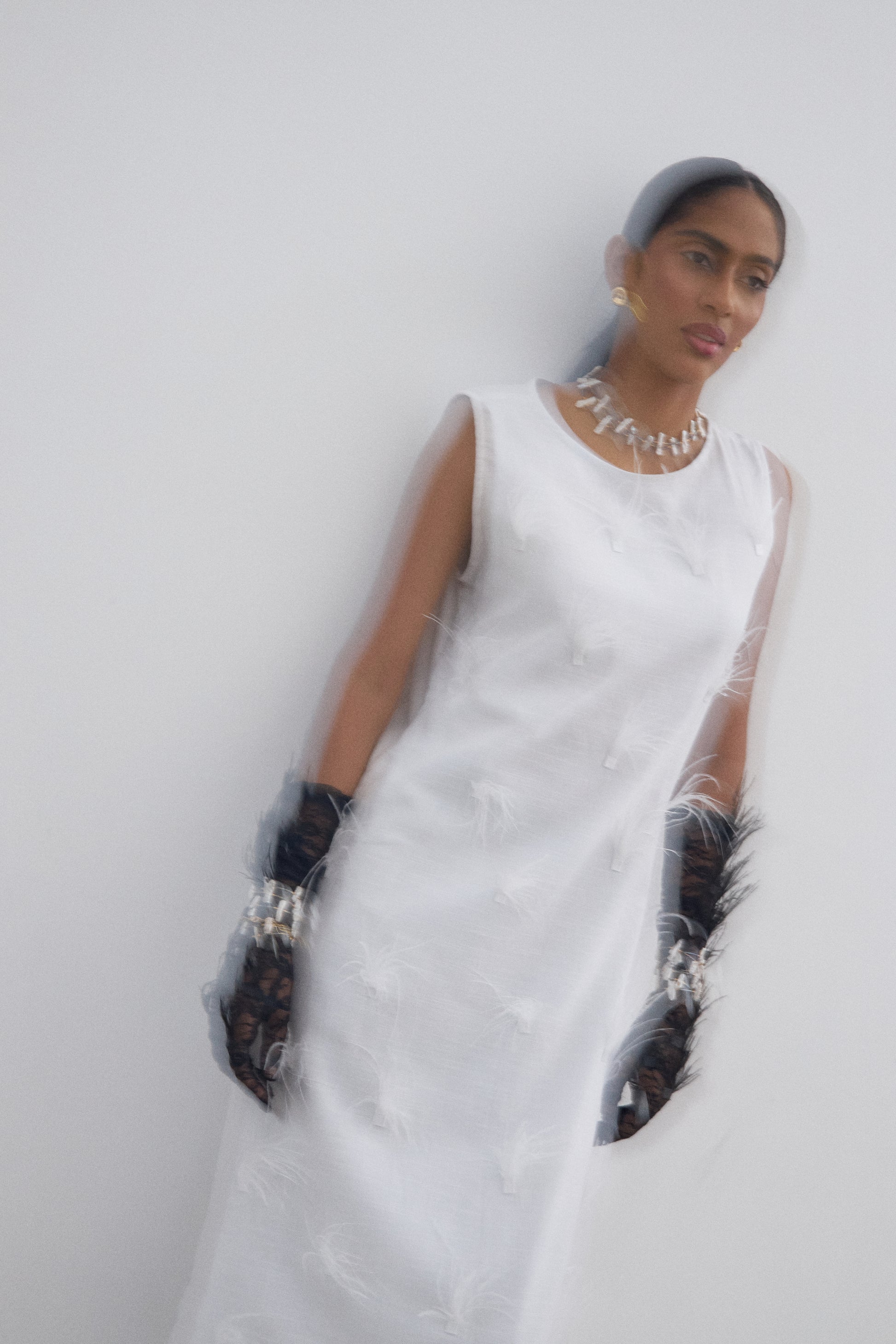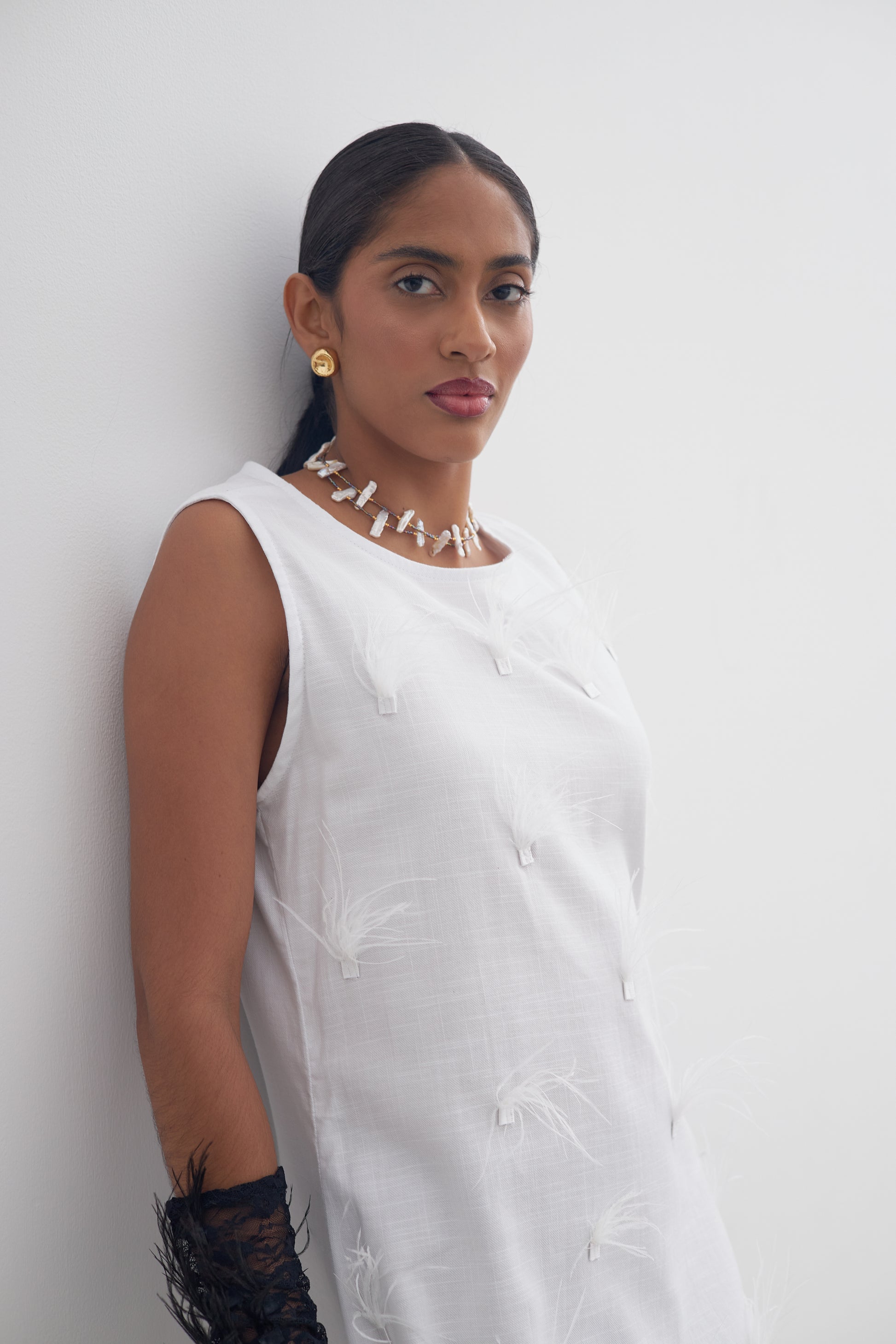 Talego en lino algodón 100%, en tono blanco y negro, bordado en plumas de seda a tono y manga sisa. Artesanía de lujo Colombiana.